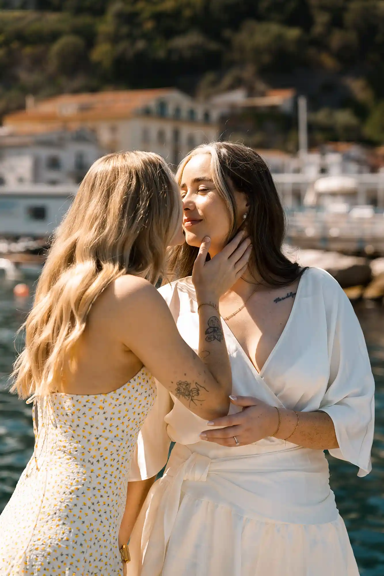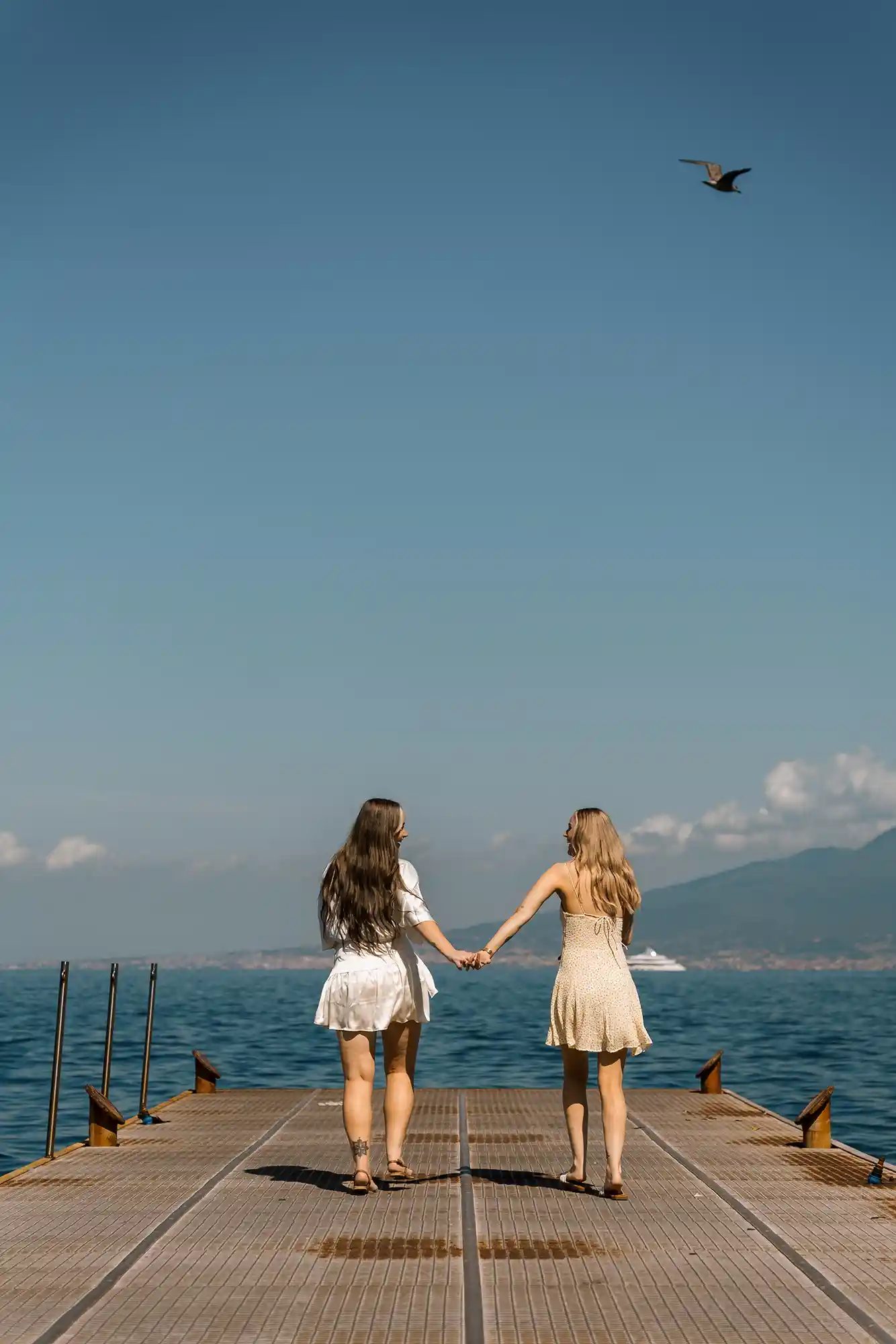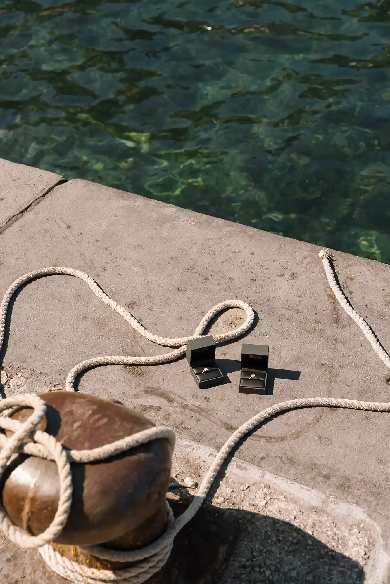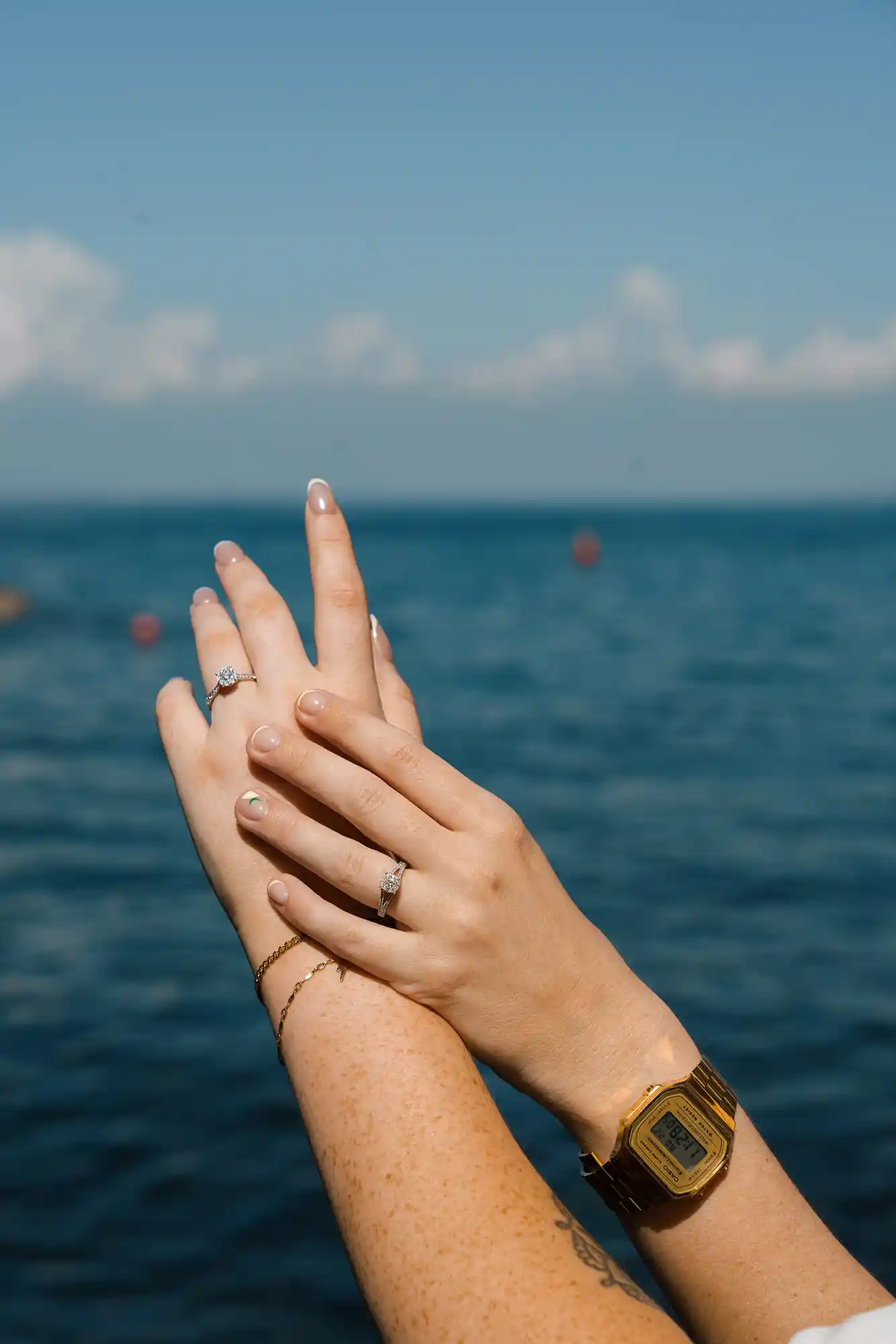 One of my favorite moments during this same-sex couple engagement photoshoot was focusing on their rings. There was something especially inspiring in having not one, but two beautiful engagement rings — each with its own character, its own quiet story. For me as a photographer, it felt like a kind of doubled beauty, a chance to explore details, reflections, and light in a more layered, artistic way. We captured them on the pier, with the sea stretching endlessly behind, and the whole moment felt calm, intimate, and deeply personal.